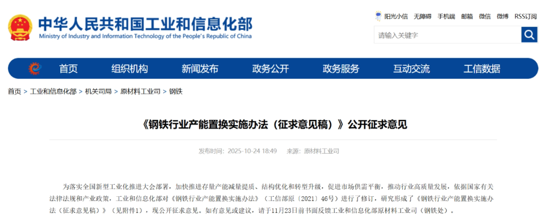 工信部網站10月24日消息,工業和信息化部對《鋼鐵行業產能置換實施辦法》進行了修訂,研究形成了《鋼鐵行業產能置換實施辦法(征求意見稿)》,現公開征求意見。